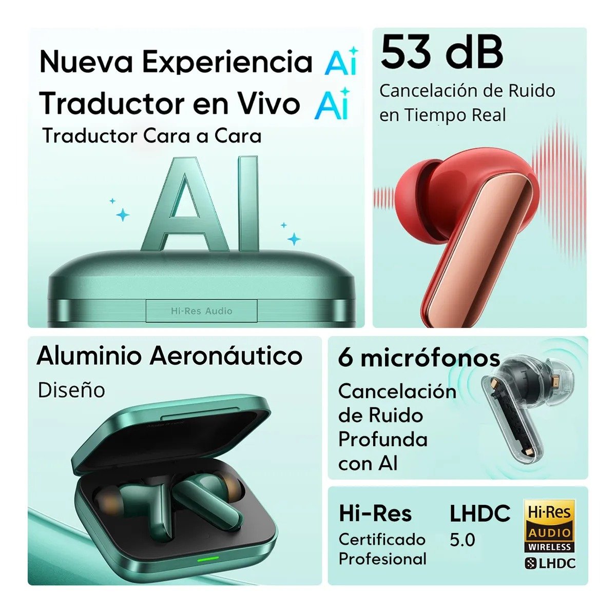 Realme Buds Air 7 Pro con audio de Alta Resolución, Simulación Ai y 48 horas de Batería, en color Blanco, Gris, Rojo y Verde.