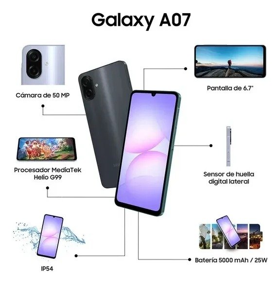 Samsung Galaxy A07 Lte con Pantalla de 6.7 Pulgadas, 128 GB de Almacenamiento, 4 GB de RAM y Cámara de 50 Mpx, en color Violeta, Verde y Negro.